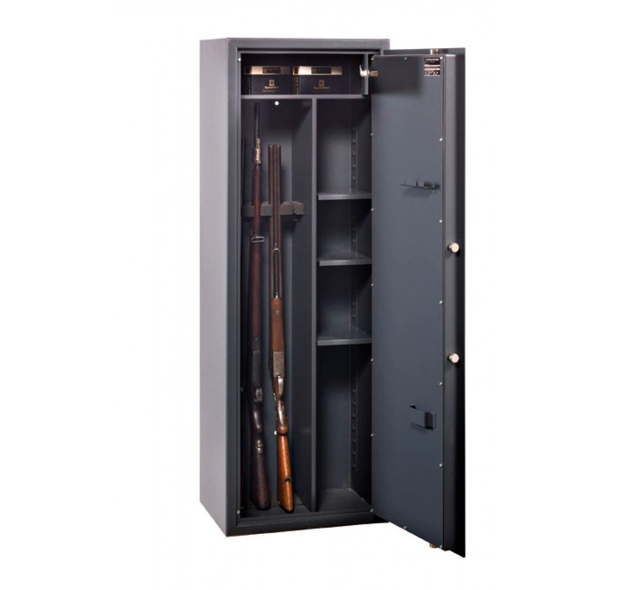 Сейф рассчитан на хранение 5 ружей с высотой до 1264 мм. Внутреннее пространство сейфа разделено на 3 части:
